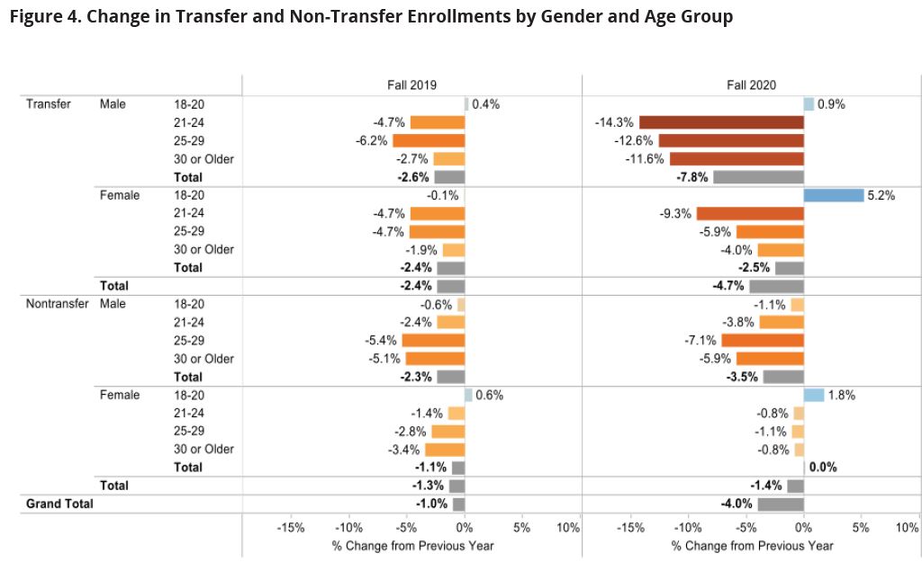 - Community colleges were hit hardest, with a 22.7 percent drop. First-time enrollment dropped regardless of age or gender, but delayed entry students (age 21-24) declined the steepest at 28.0 percent, and men declined more than women (-18.1 percent vs. -14.6 percent). This signifies a looming crisis for community colleges.